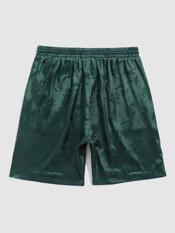 Men's Jacquard Silky Satin Floral Print Rose Pattern Button Front Short Sleeve Shirt And Shorts Set